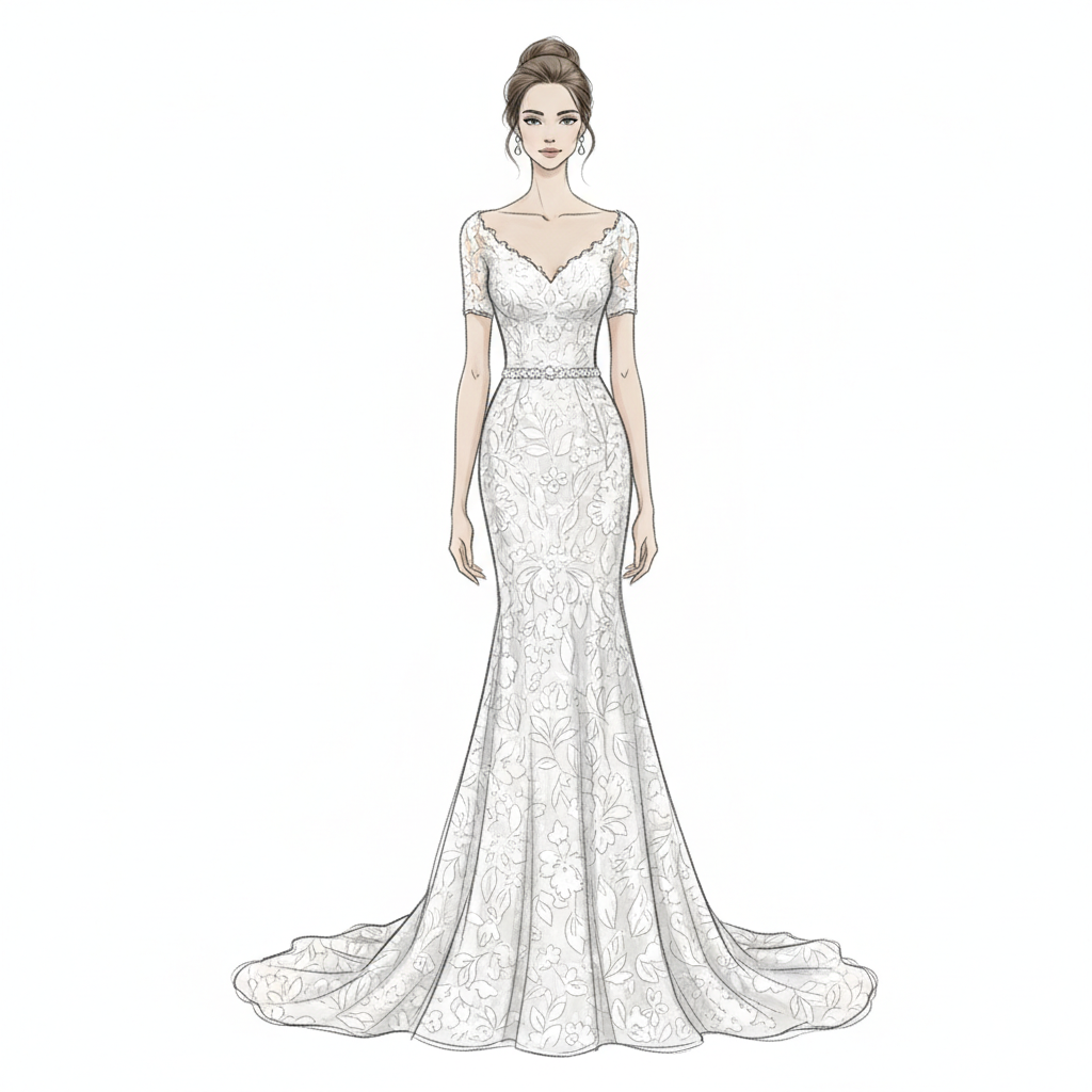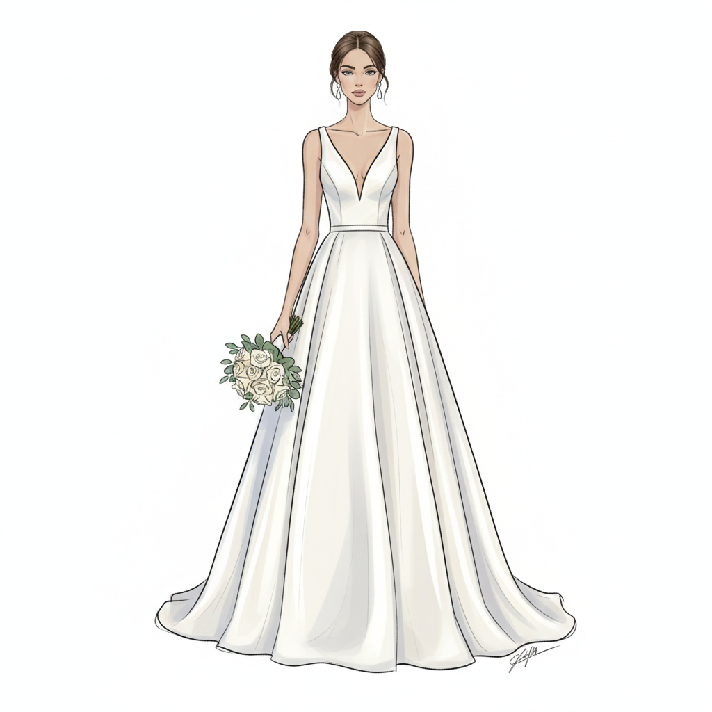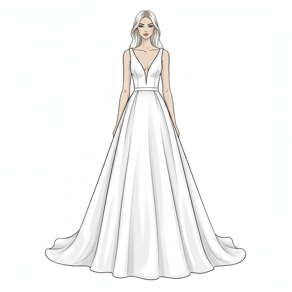 You can design all popular wedding dress silhouettes: A-Line, Ball Gown, Mermaid, Sheath, Empire Waist, and Fit and Flare. Mix with various necklines (Sweetheart, V-neck, Strapless, Off-the-Shoulder, Halter, Square), fabrics (Satin, Lace, Tulle, Chiffon, Organza), and embellishments.
